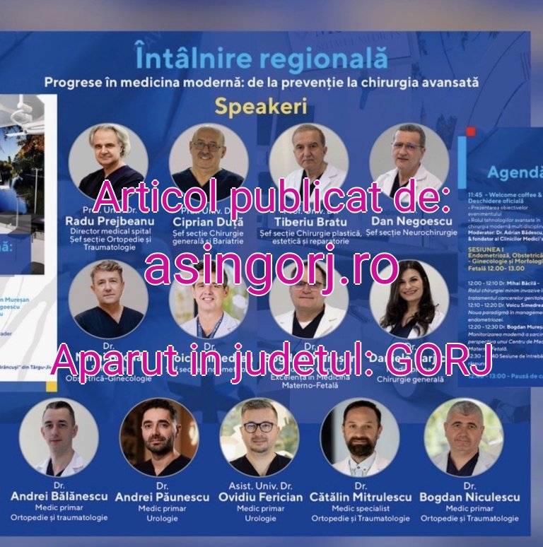 Întâlnirea regională intitulată „Progrese în medicina modernă: de la prevenție la chirurgia avansată” va avea loc în intervalul 12:00 – 17:00, în Amfiteatrul Universității „Constantin Brâncuși”, reunind medici de prestigiu, profesori universitari și specialiști recunoscuți la nivel național și internațional.